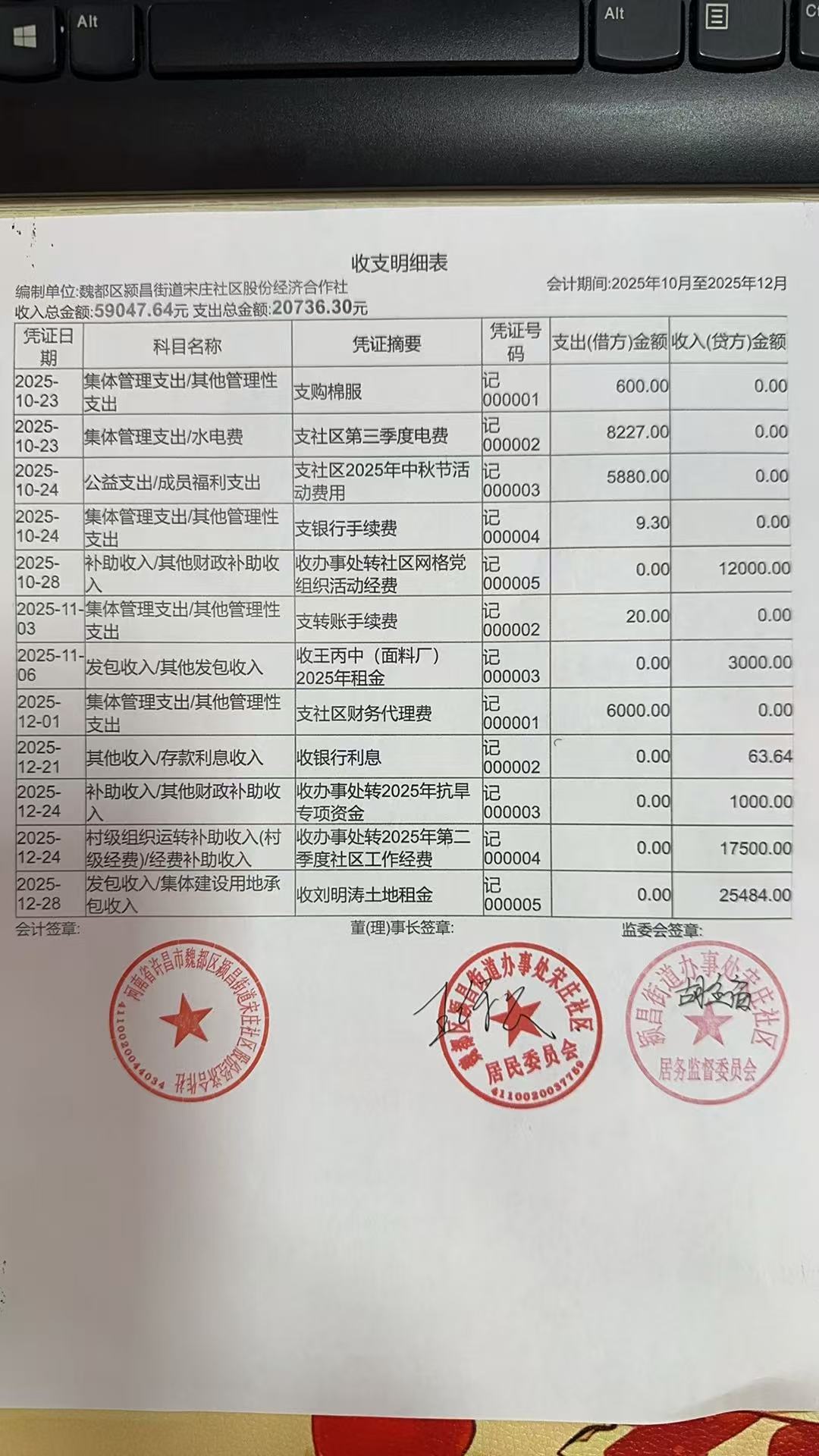 颍昌街道办事处宋庄社区2025年第四季度银行存款收支公开表