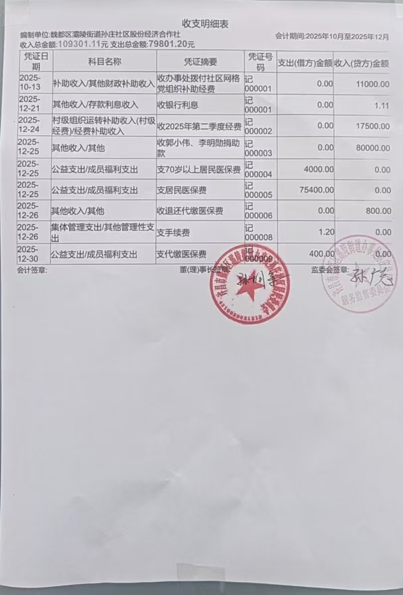 灞陵办事处孙庄社区2025年第四季度银行存款收支公开表