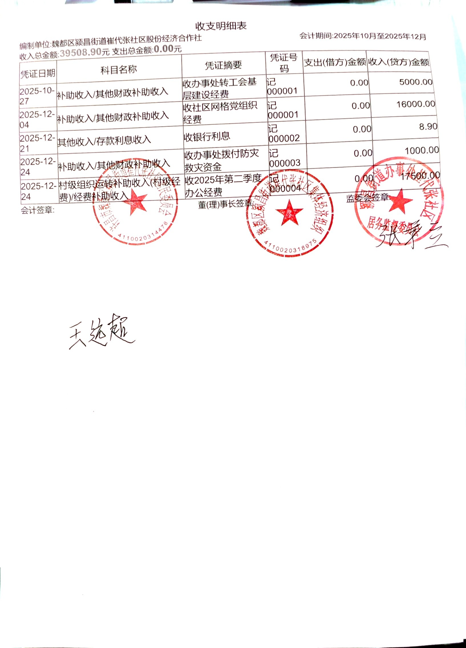 颍昌街道办事处崔代张社区2025年第四季度银行存款收支公开表