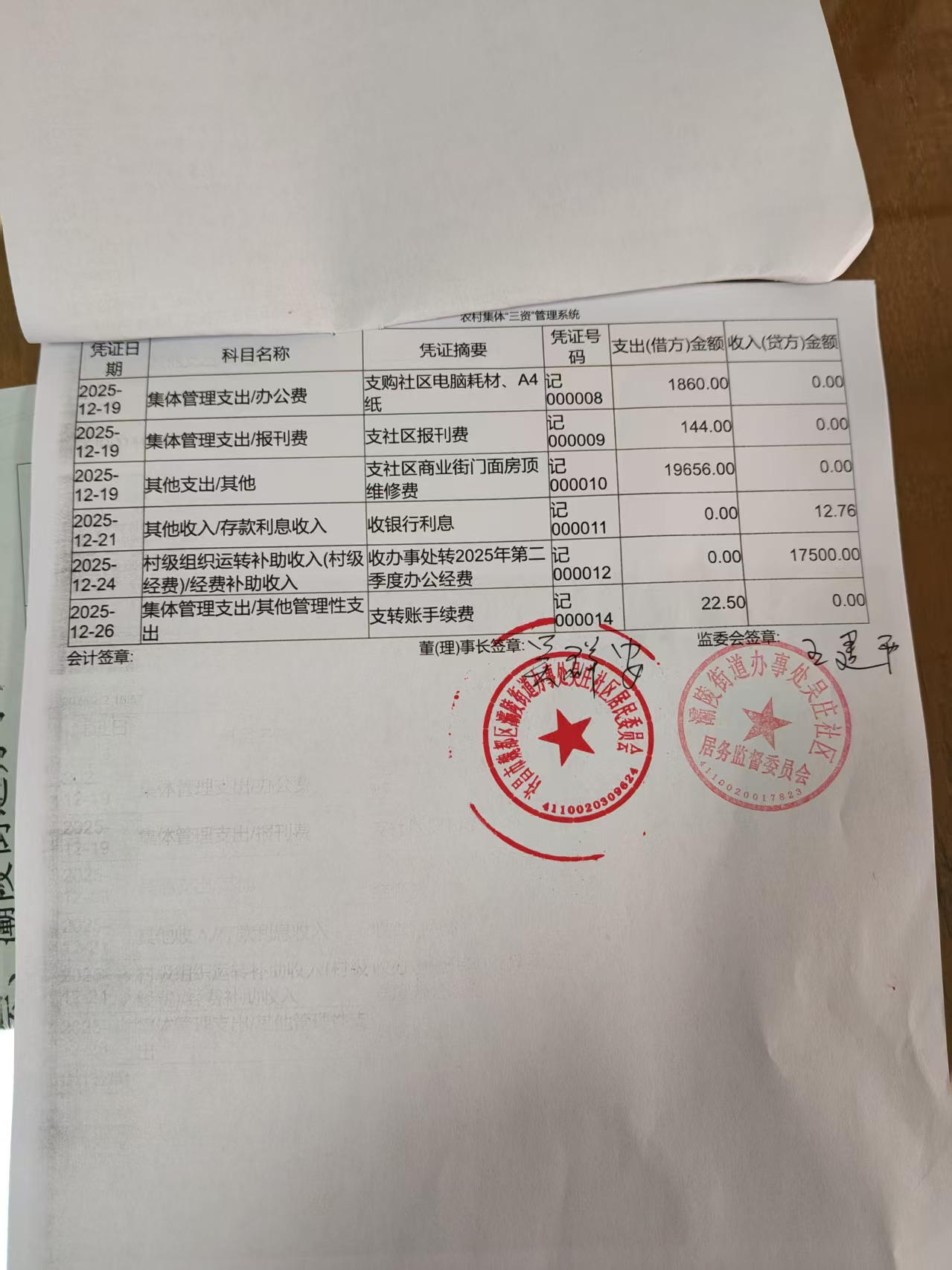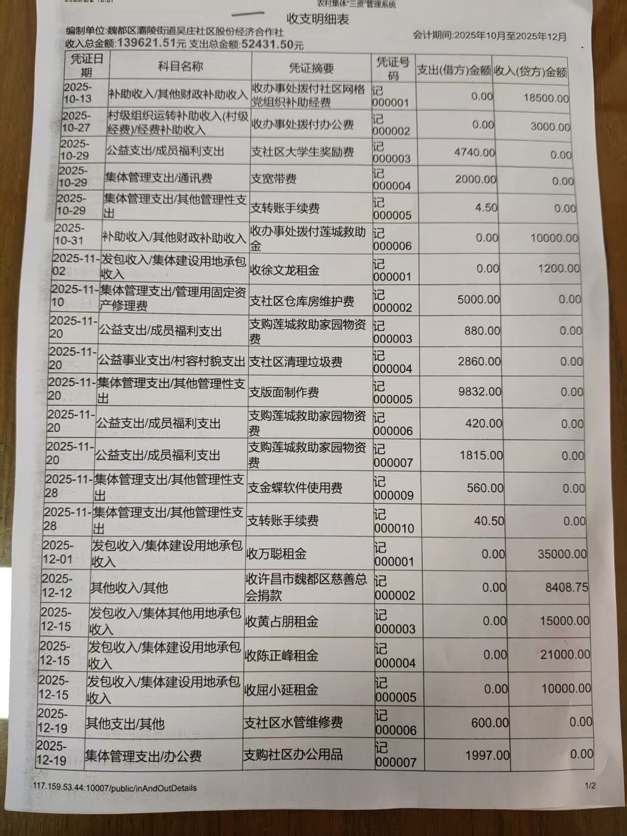 灞陵办事处吴庄社区2025年第四季度银行收支公开表