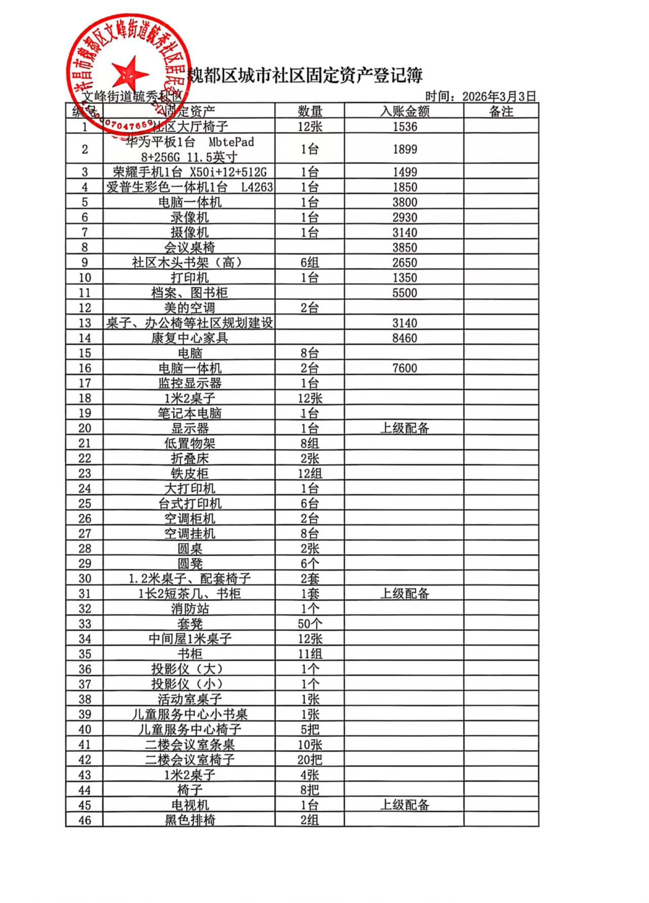 文峰办事处毓秀社区固定资产公示表