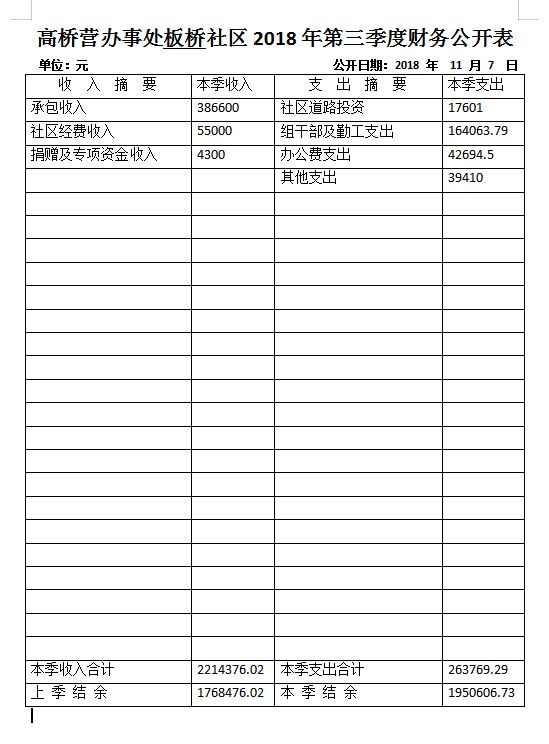高桥营办事处板桥社区2018年第三季度财务公开表