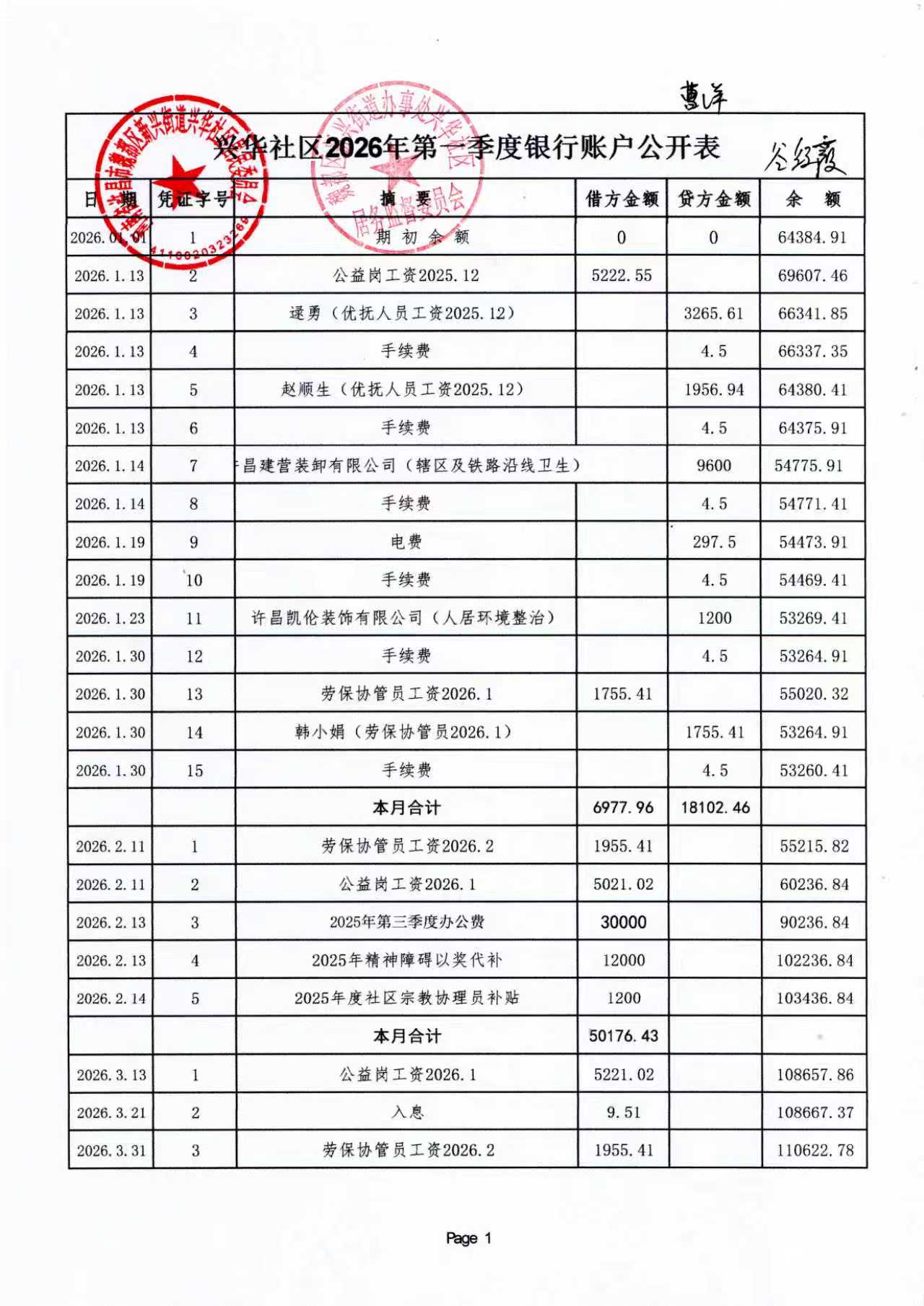 新兴街道办事处兴华社区2026年第一季度银行存款收支公开表