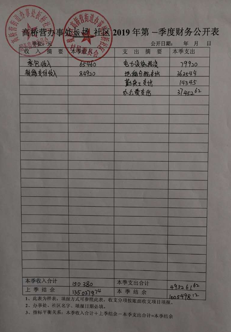 高桥营办事处板桥社区2019年第一季度财务公开表