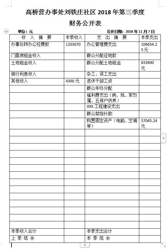 高桥营办事处刘铁庄社区2018年第三季度财务公开表