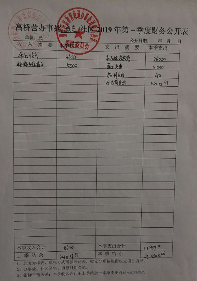 高桥营办事处刘铁庄社区2019年第一季度财务公开表