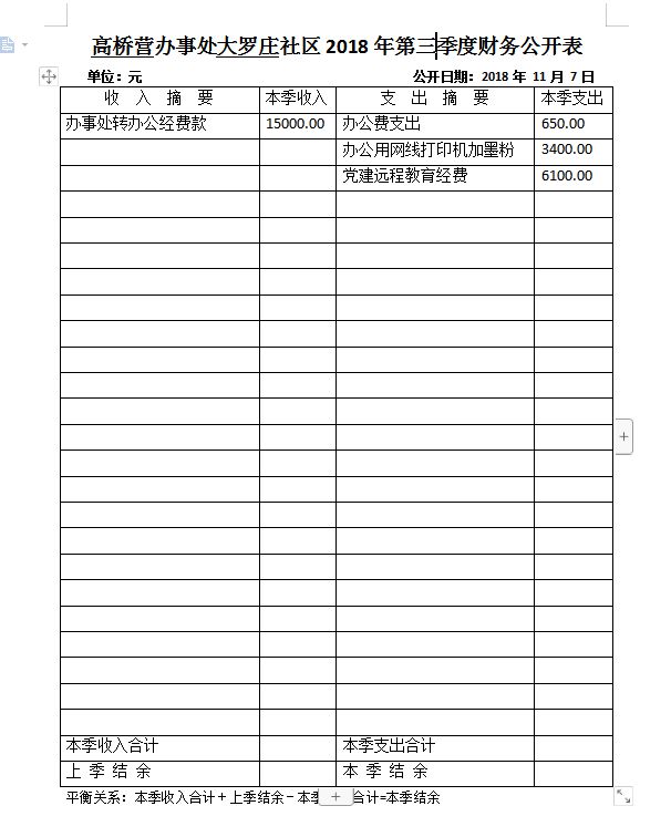 高桥营办事处大罗庄社区2018年第三季度财务公开表