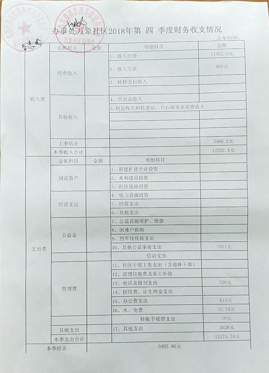 西关办事处万象社区2018年第四季度财务公开表