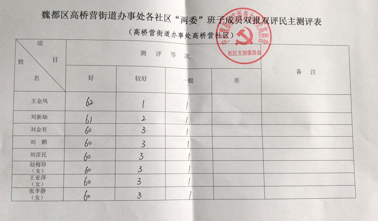 高桥营办事处高桥营社区“双报双评”评议结果