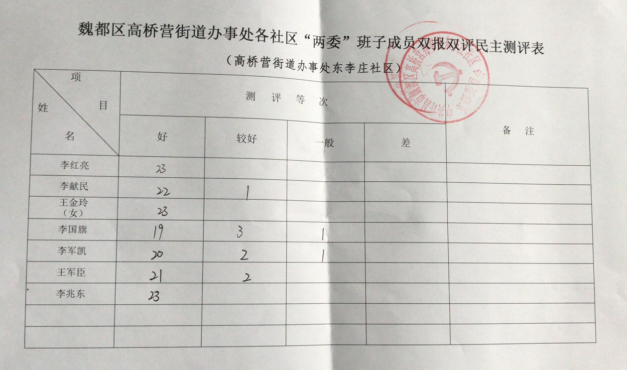 高桥营办事处东李庄社区“双报双评”评议结果