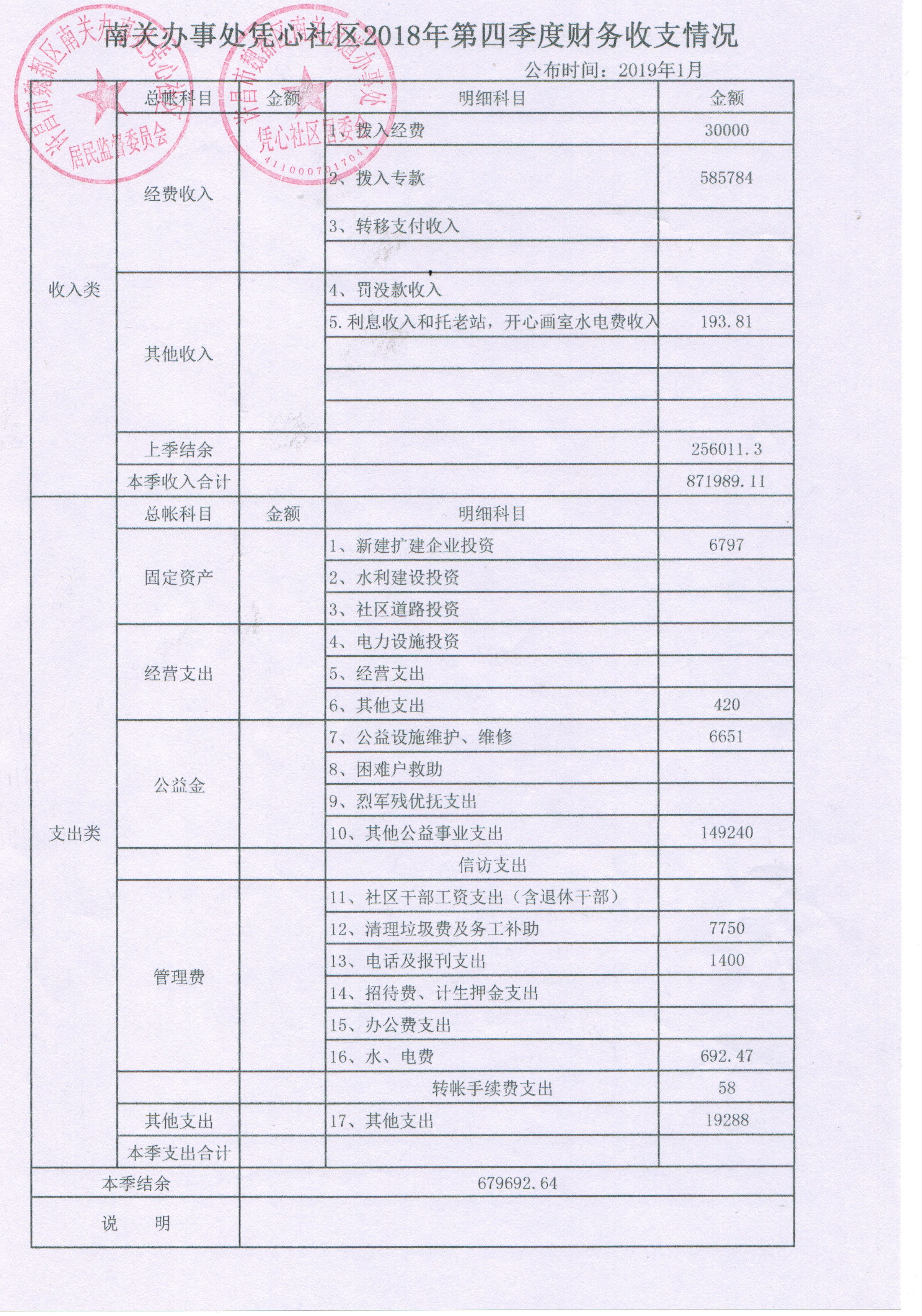 南关办事处凭心社区2018年第四季度财务公开表