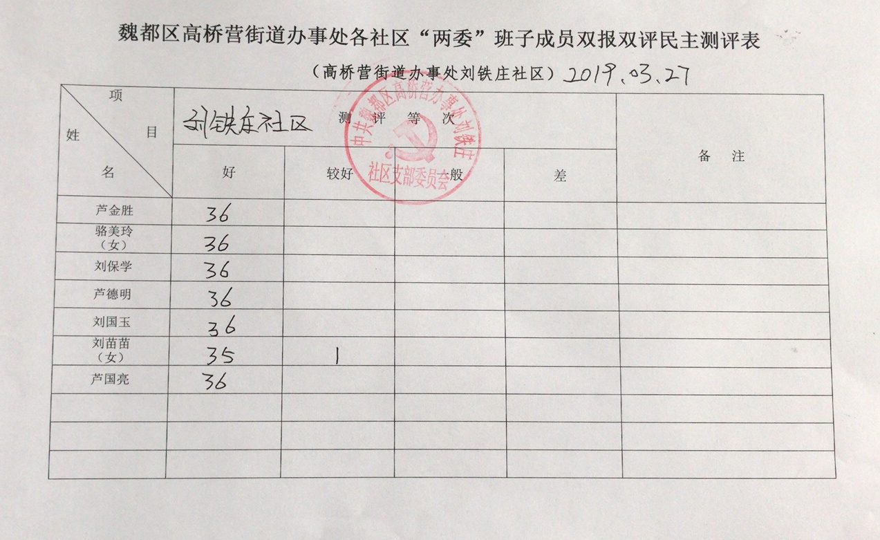 高桥营办事处刘铁庄社区“双报双评”评议结果