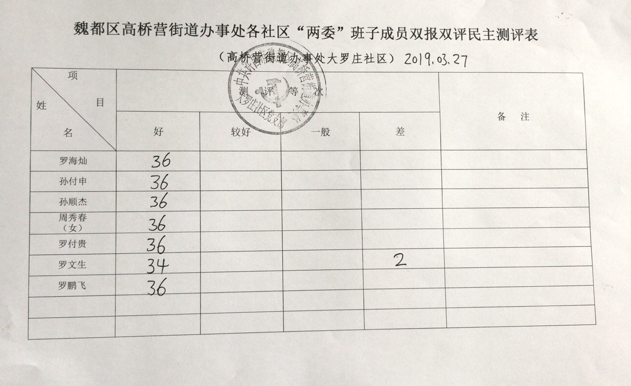 高桥营办事处大罗庄社区“双报双评”评议结果
