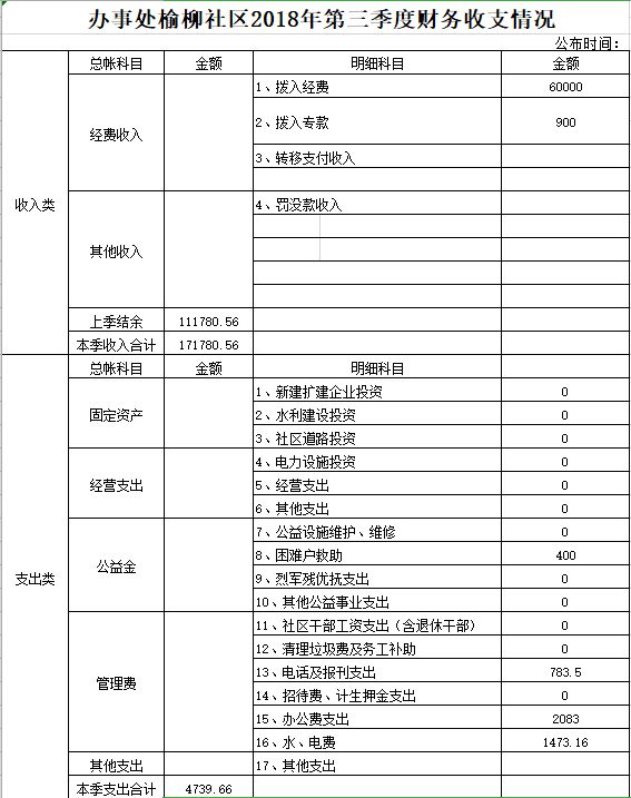 西大办事处榆柳社区2018年第三季度财务公开表