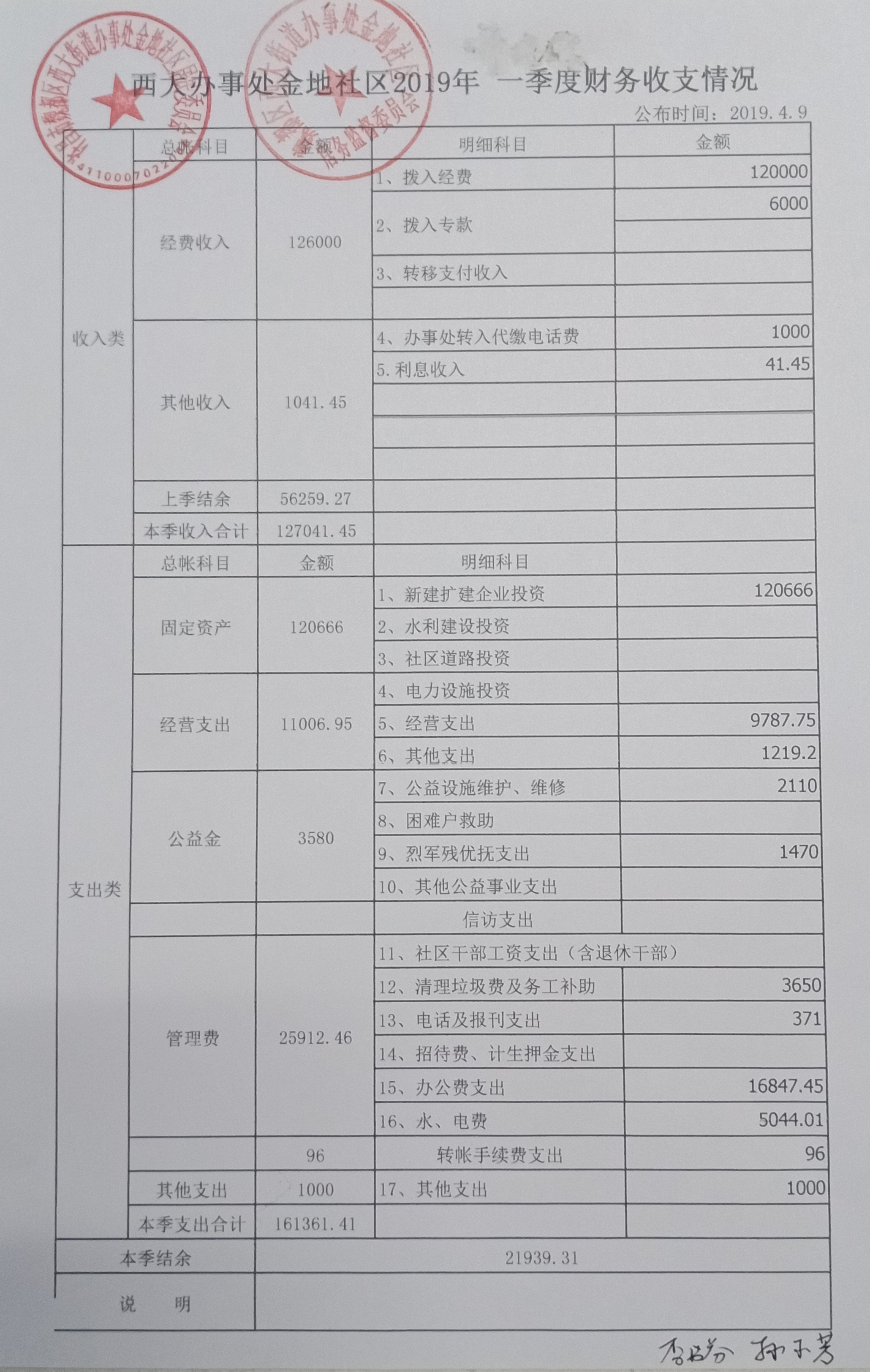 西大办事处金地社区2019年第一季度财务公开表