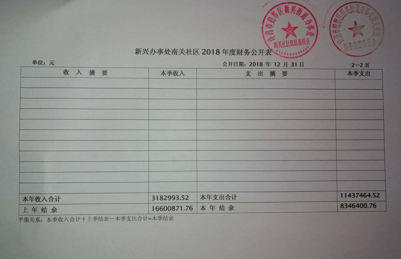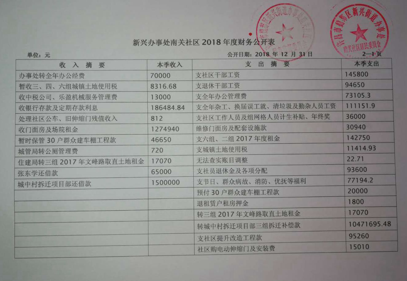新兴办事处南关社区2018年度财务公开表