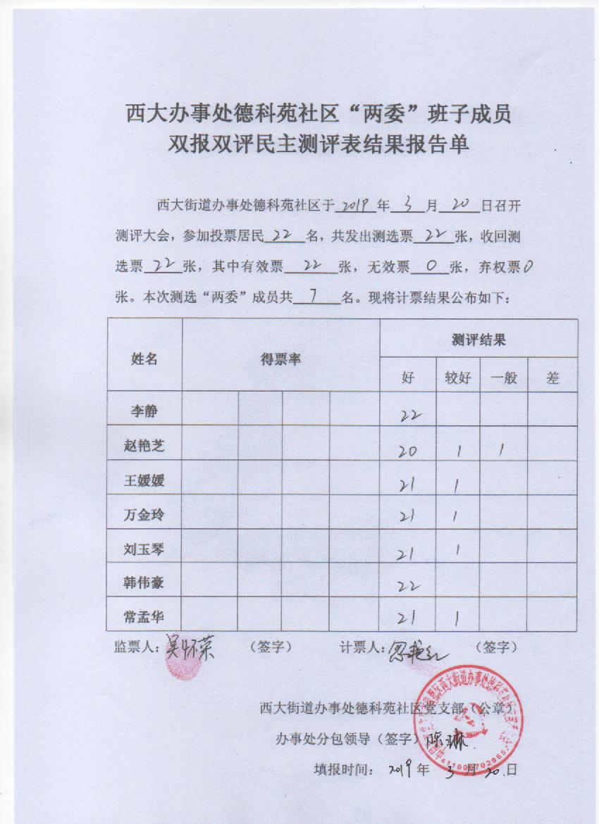 西大办事处德科苑社区“双报双评”评议结果