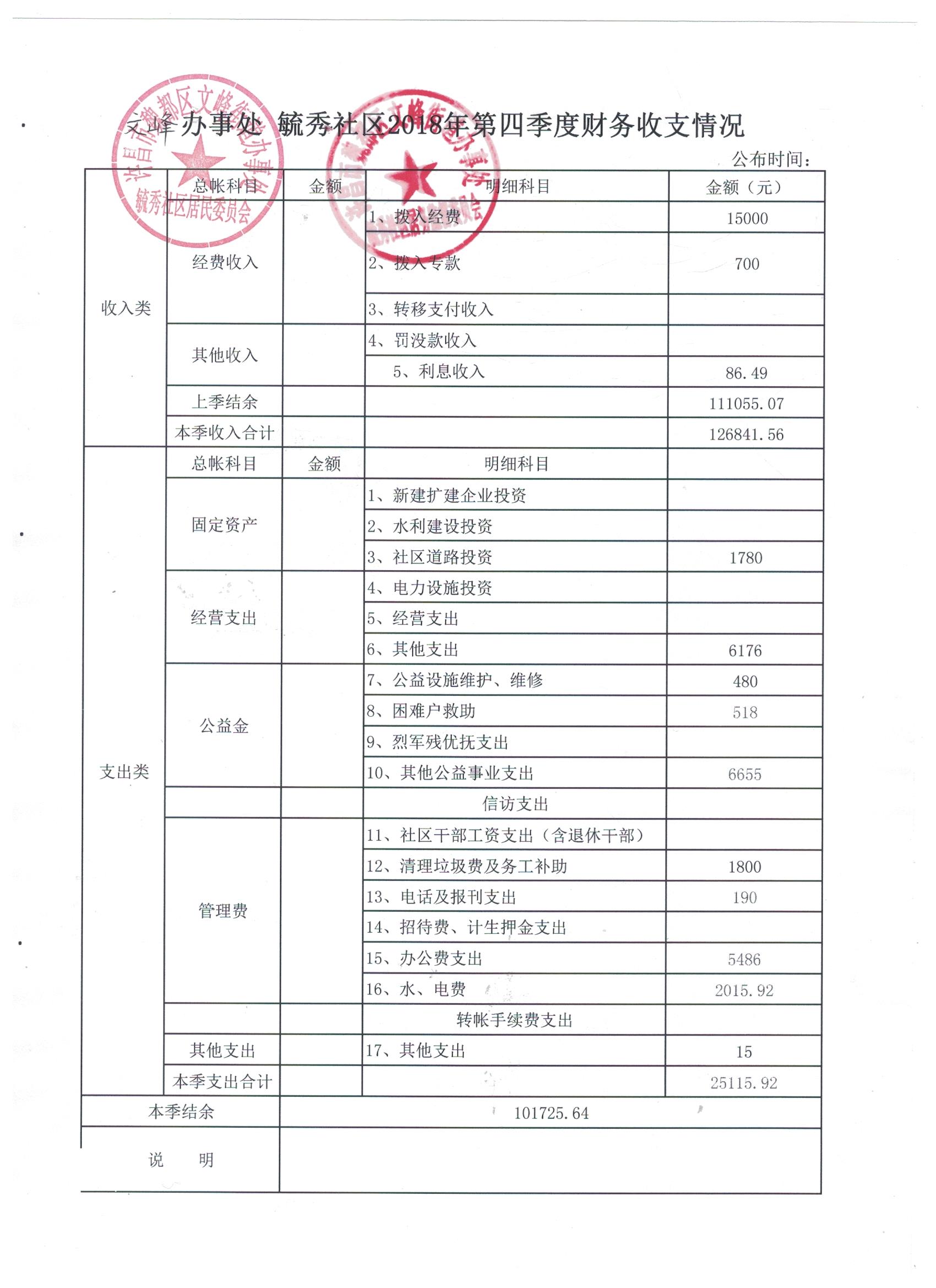 文峰办事处毓秀社区2018年第四季度财务公开表