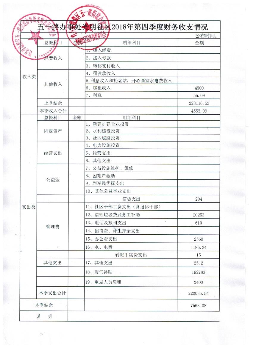 五一路办事处光明社区2018年第四季度财务公开表
