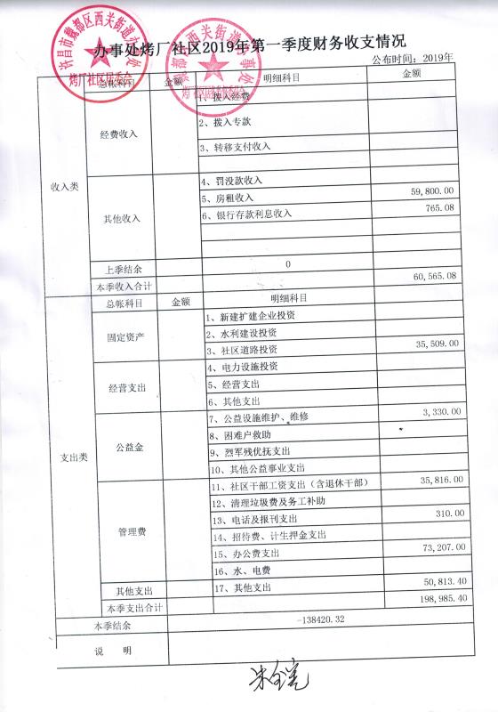 西关办事处烤厂社区2019年第一季度财务公开表