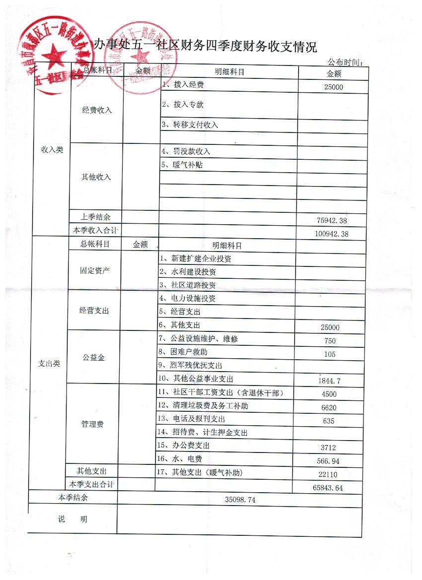 五一路办事处五一社区2019年第四季度财务公开表
