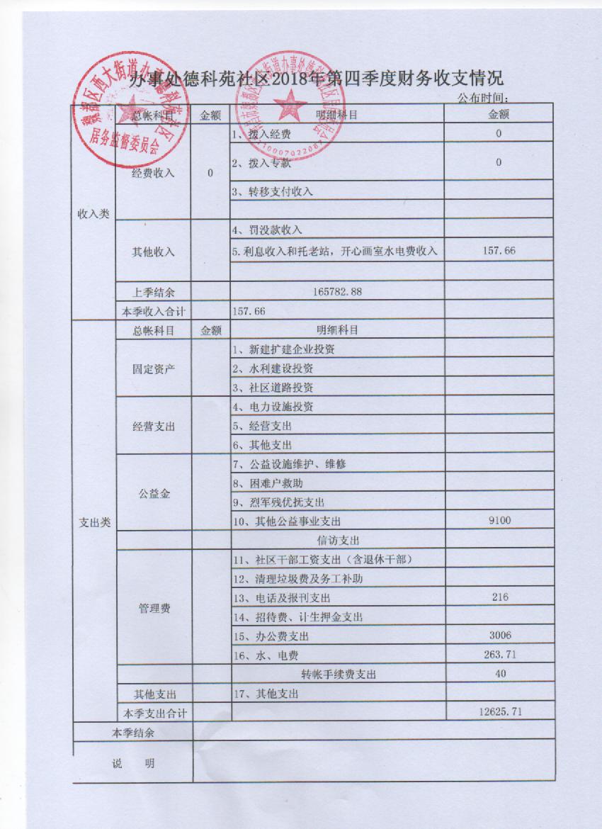 西大办事处德科苑社区2018年第四季度财务公开表