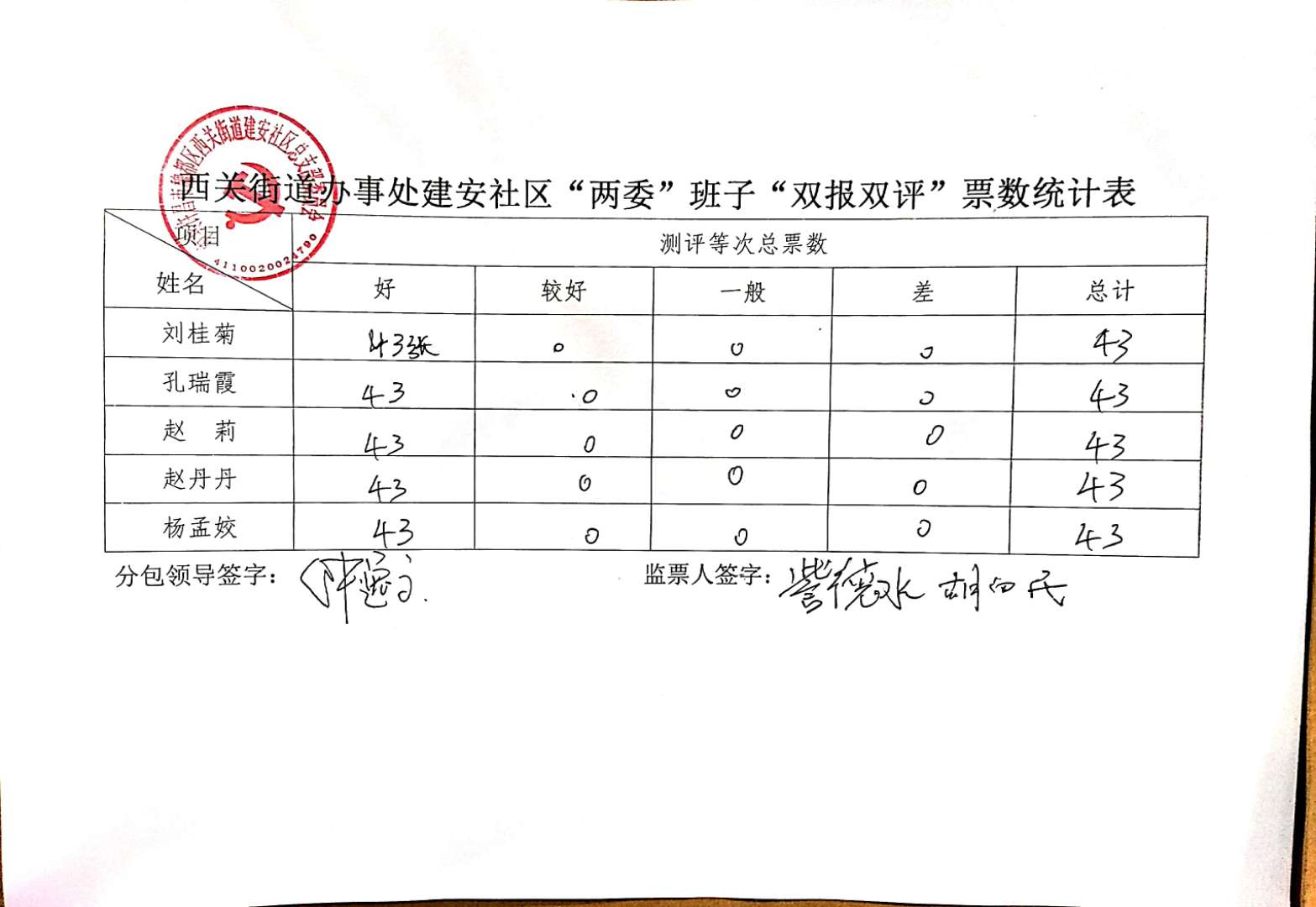 西关办事处建安社区“双报双评”评议结果