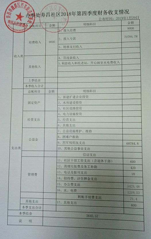 西关办事处寿昌社区2018年第四季度财务公开表