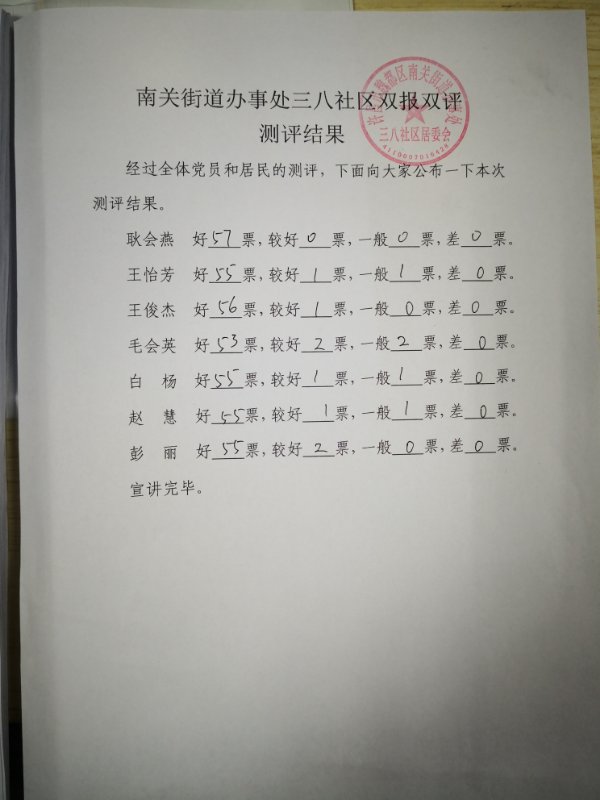 南关办事处三八社区“双报双评”评议结果