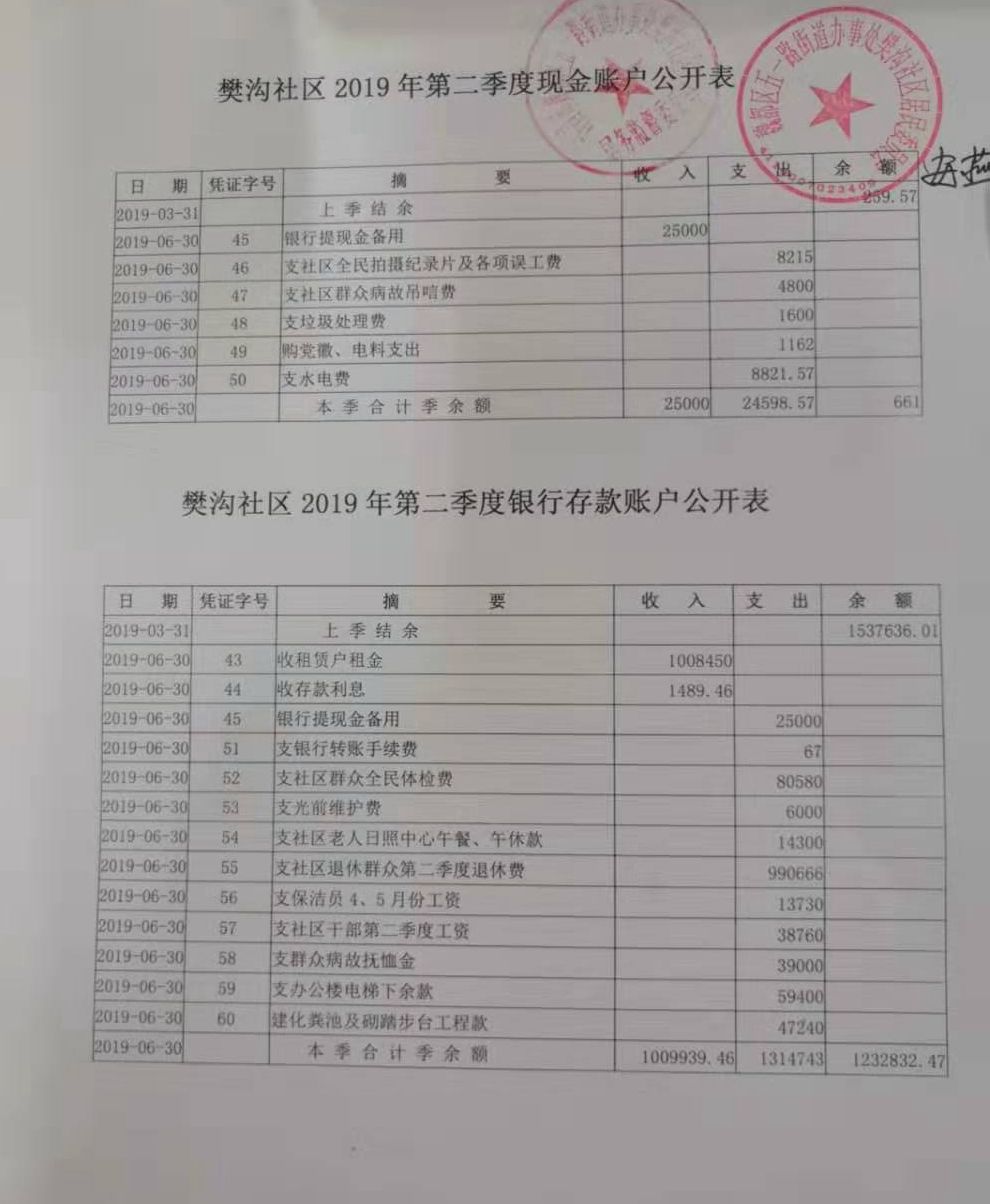 五一路办事处樊沟社区2019年第二季度财务公开表
