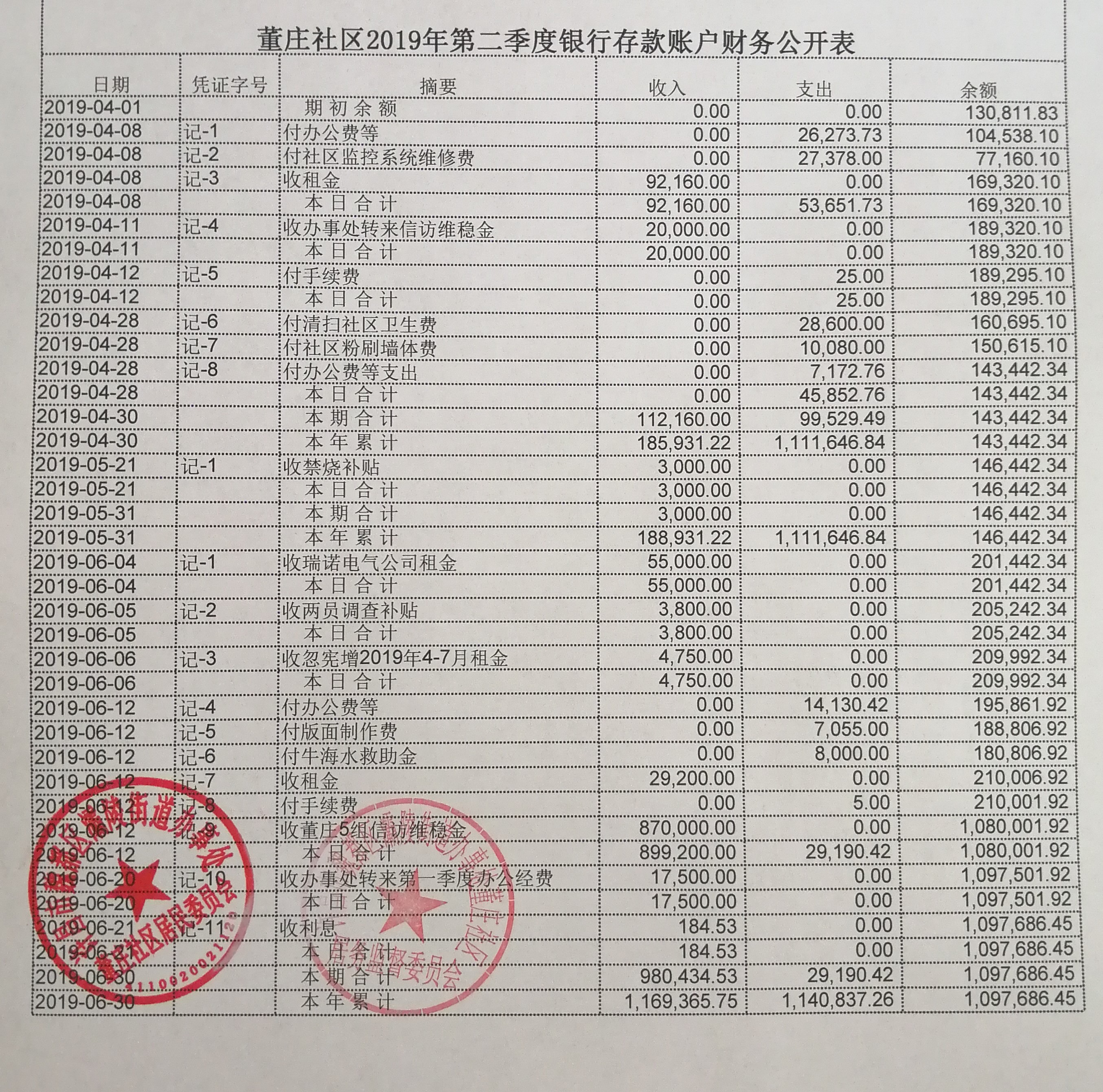 灞陵办事处董庄社区2019年第二季度财务公开表