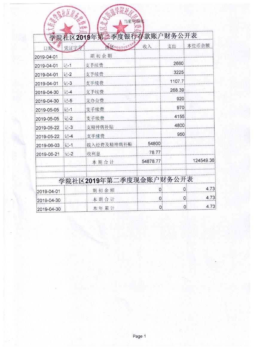 北大办事处学院社区2019年第二季度现金、银行存款账户财务公开表