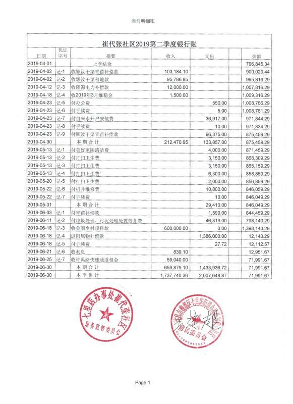 七里店办事处崔代张社区2019年第二季度银行存款账户财务公开表