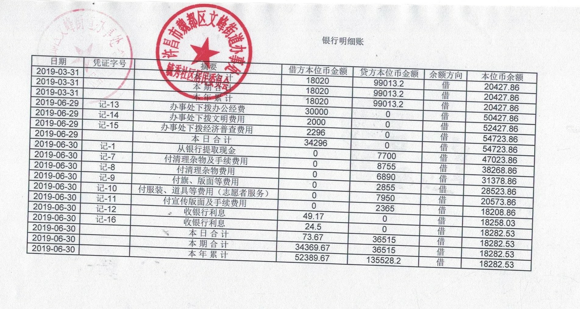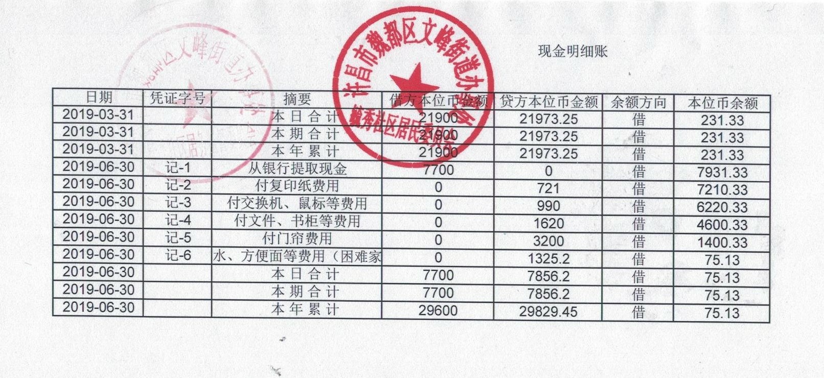 文峰办事处毓秀社区2019年第二季度现金、银行存款账户公开表