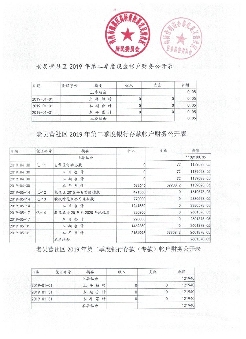 高桥营办事处老吴营社区2019年第二季度现金、银行存款账户公开表