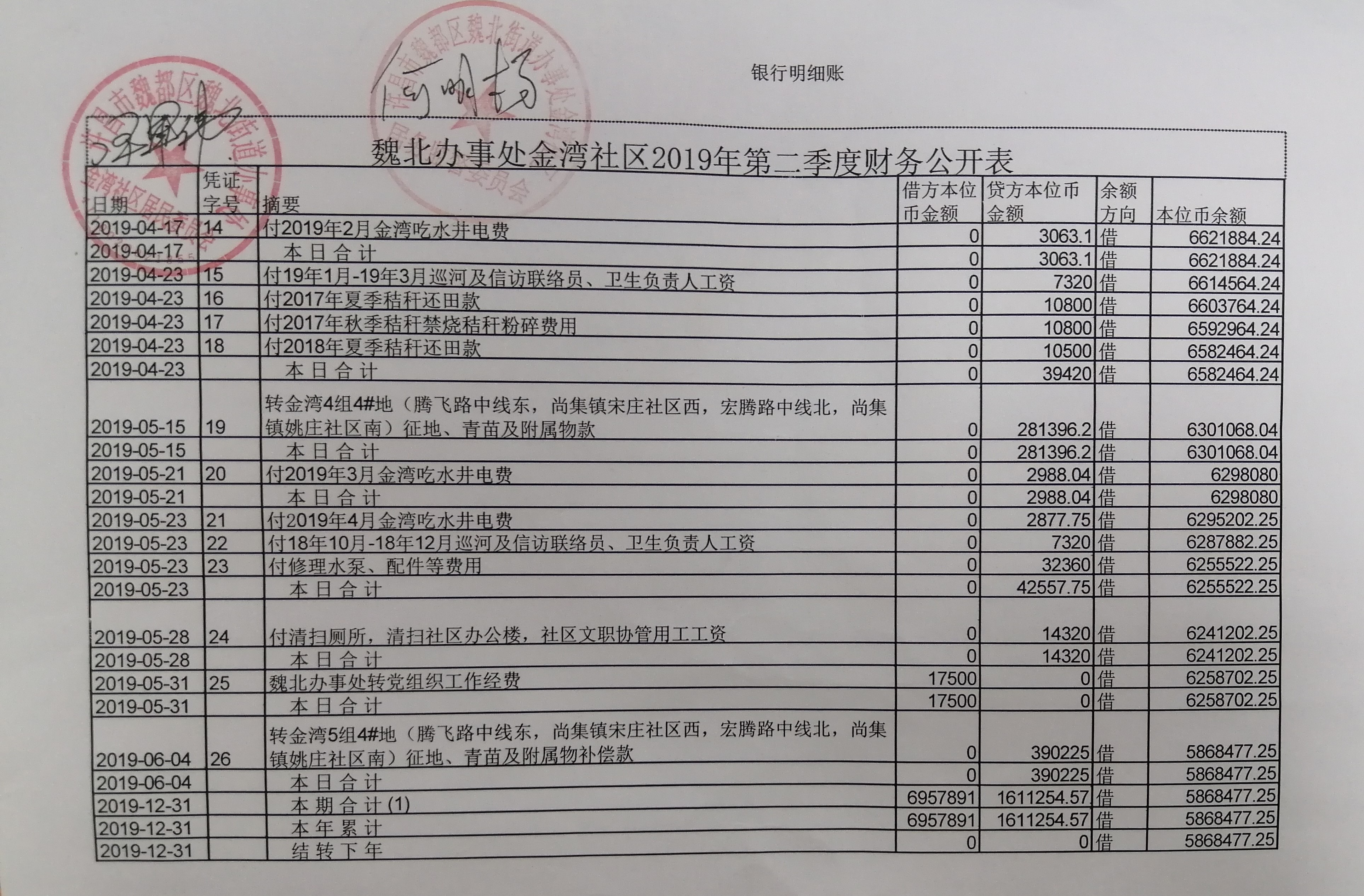 魏北办事处金湾社区2019年第二季度现金账户公开表