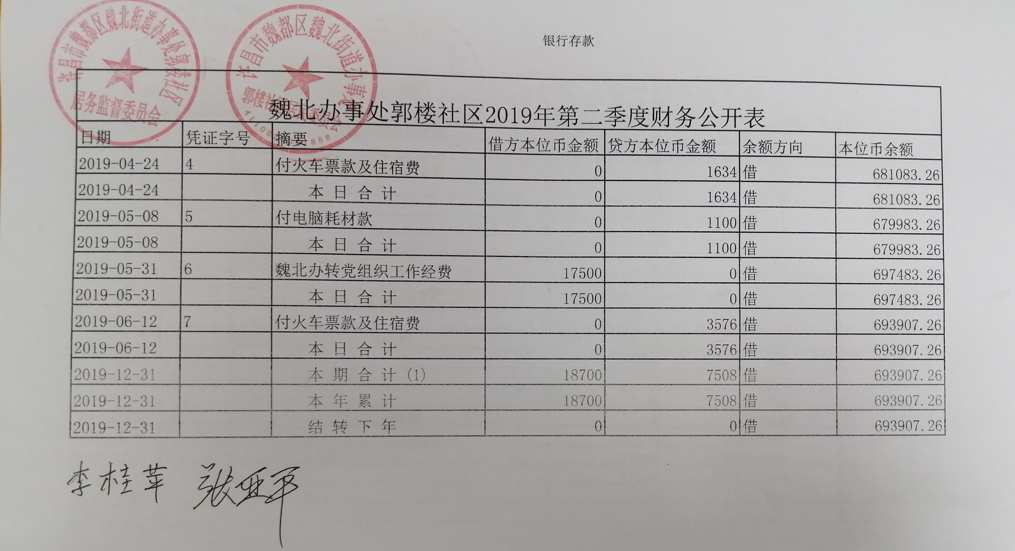魏北办事处郭楼社区2019年第二季度现金账户公开表