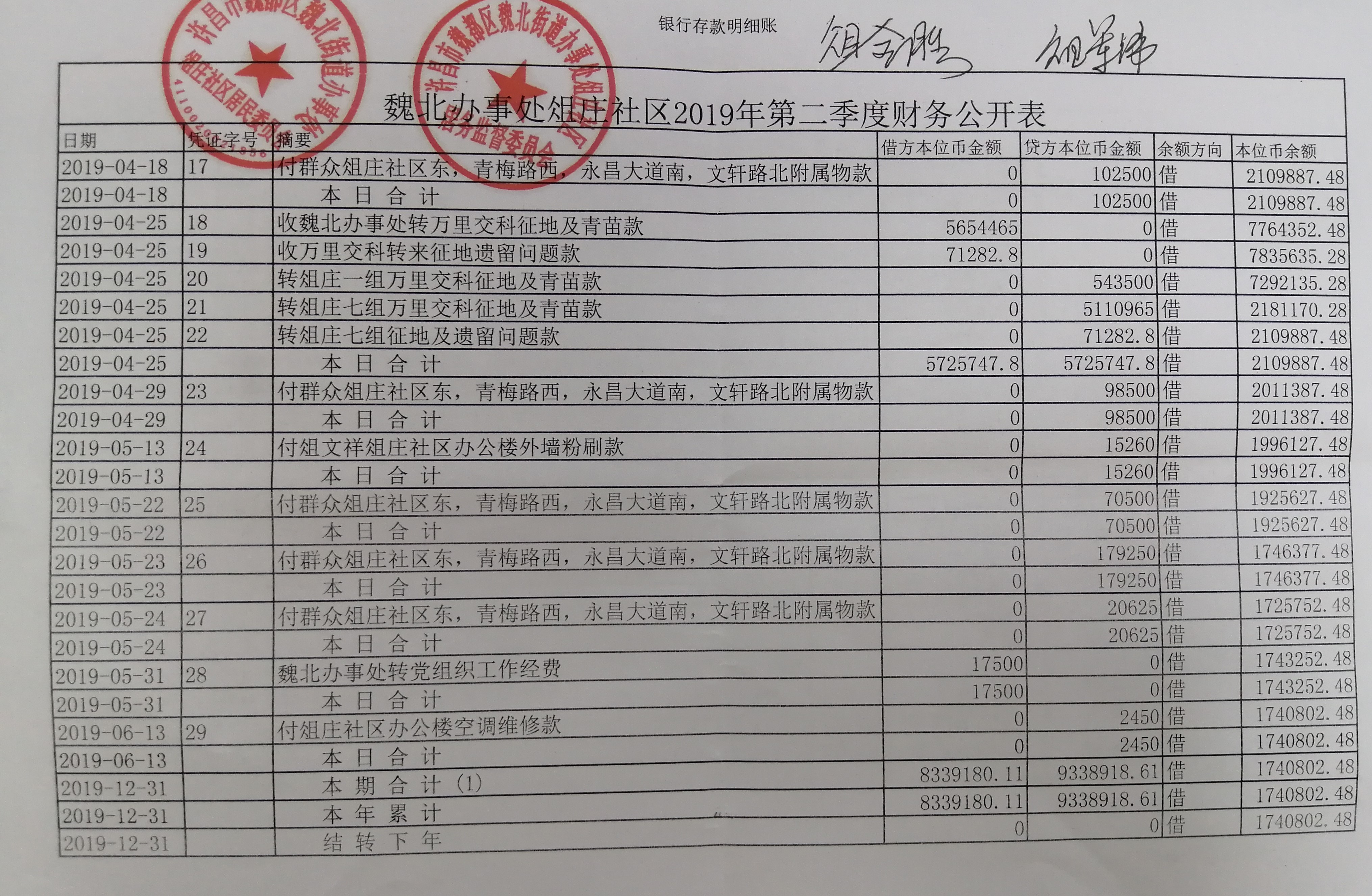 魏北办事处俎庄社区2019年第二季度现金账户公开表