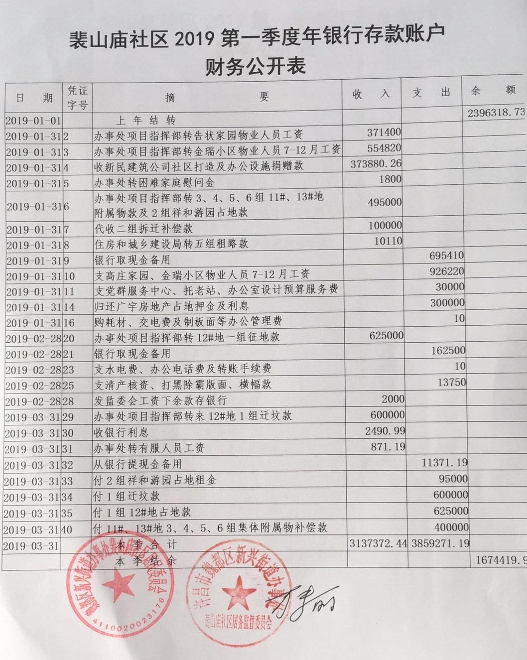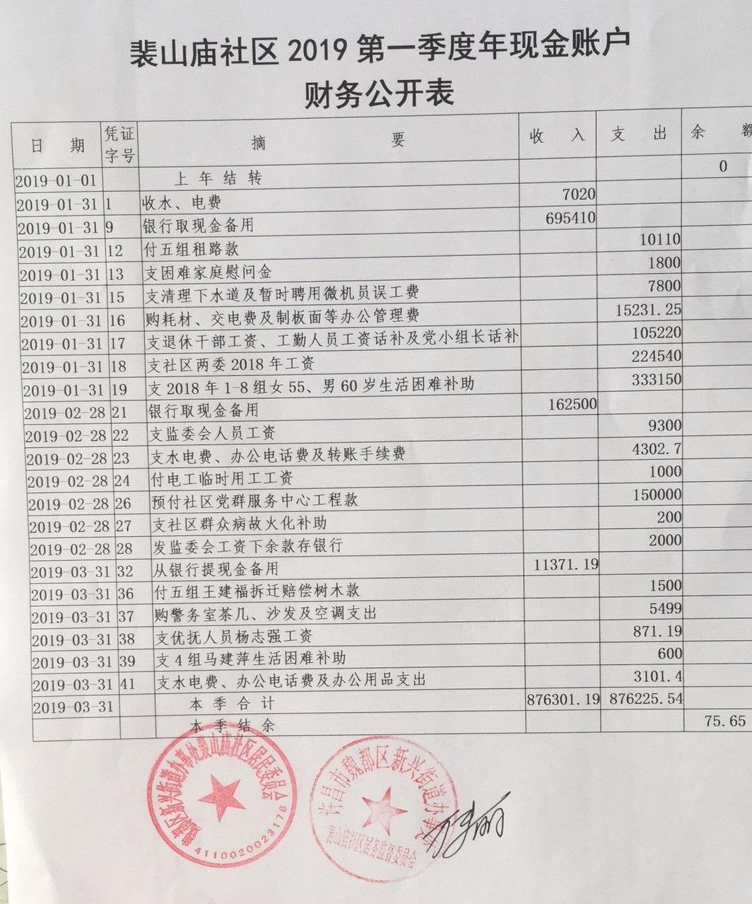 新兴办事处裴山庙社区2019年第一季度现金、银行存款账户公开表