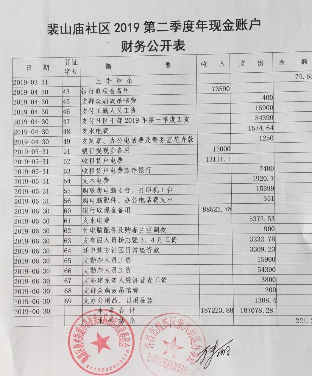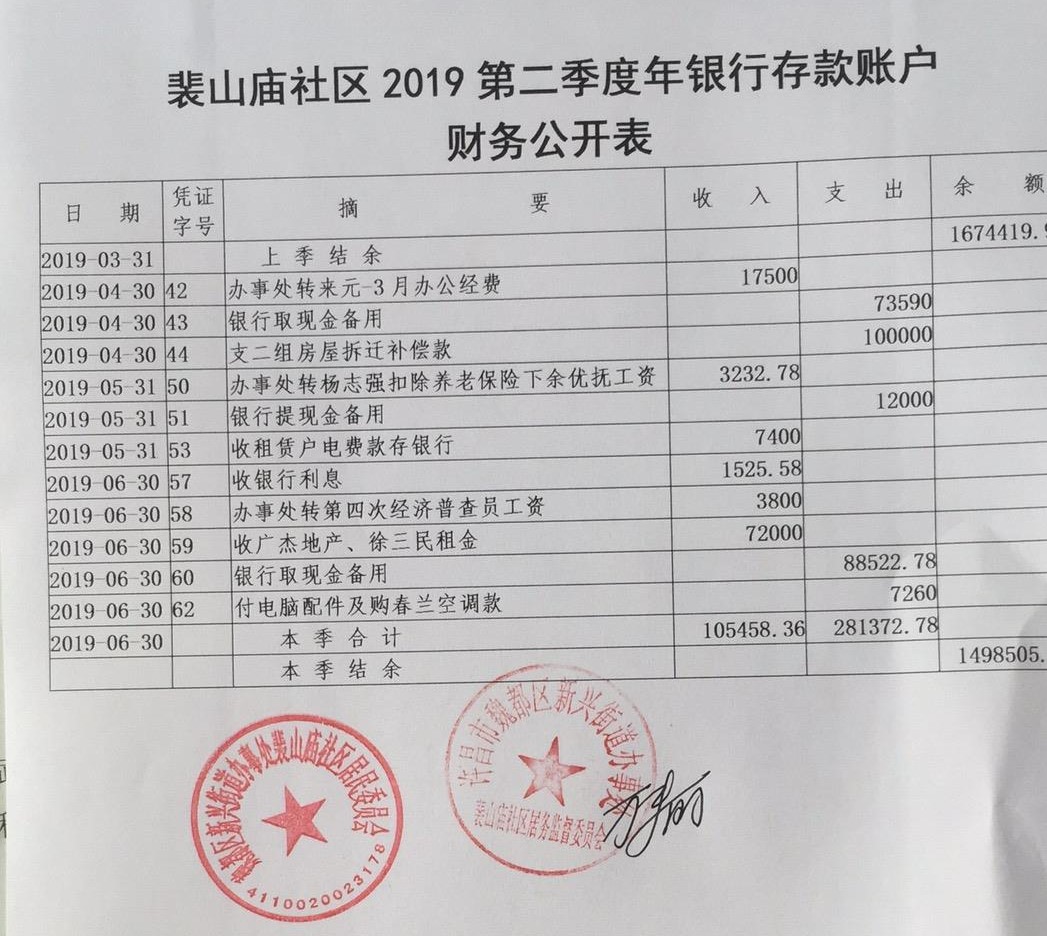 新兴办事处裴山庙社区2019年第二季度现金、银行存款账户公开表