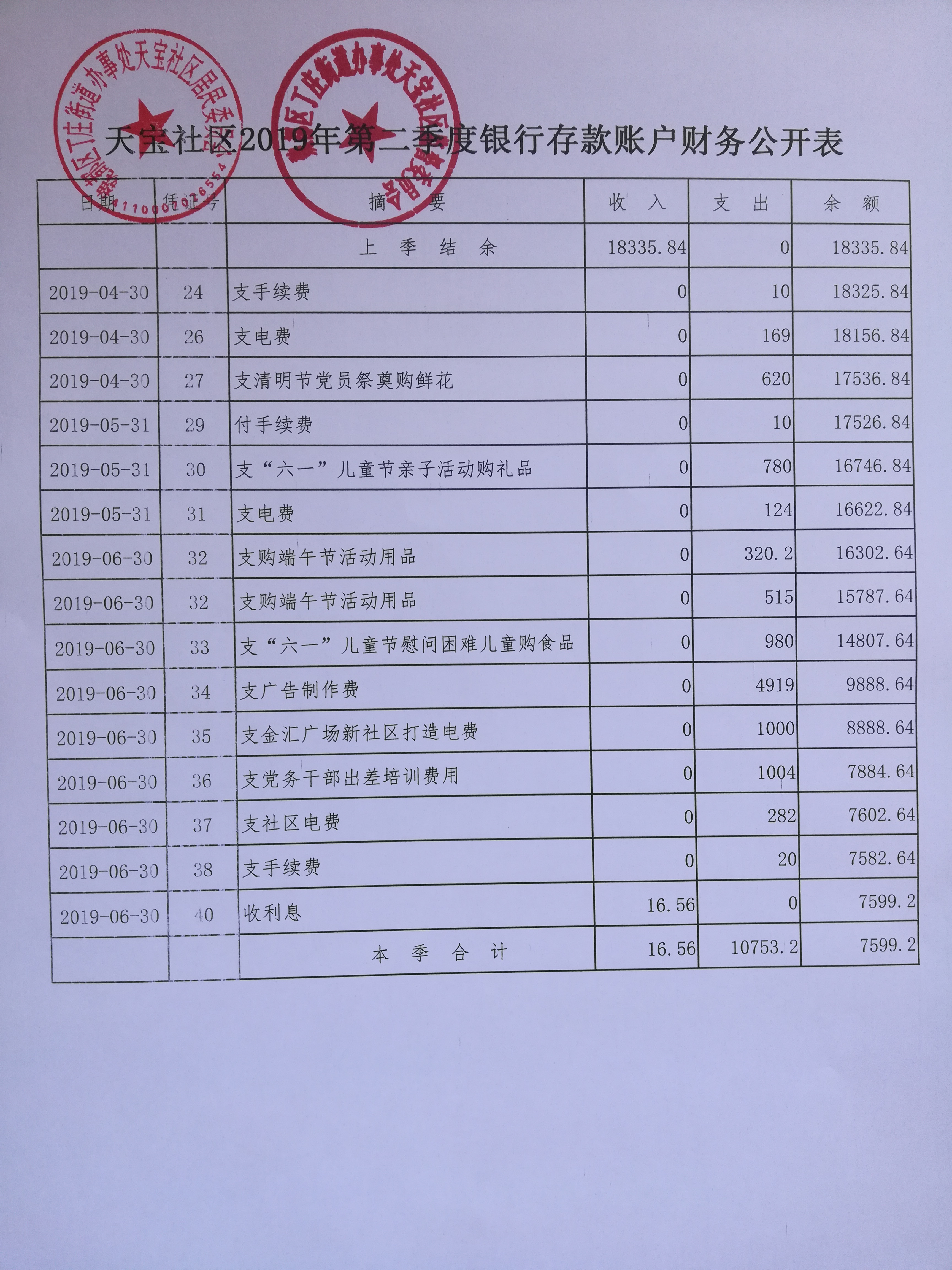 丁庄办事处天宝社区2019年第二季度银行存款账户公开表