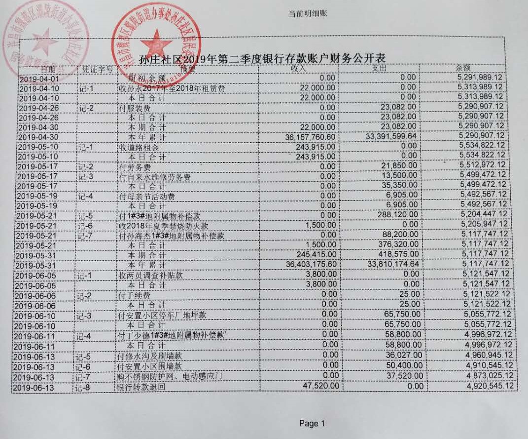 灞陵办事处孙庄社区2019年第二季度银行存款账户财务公开表