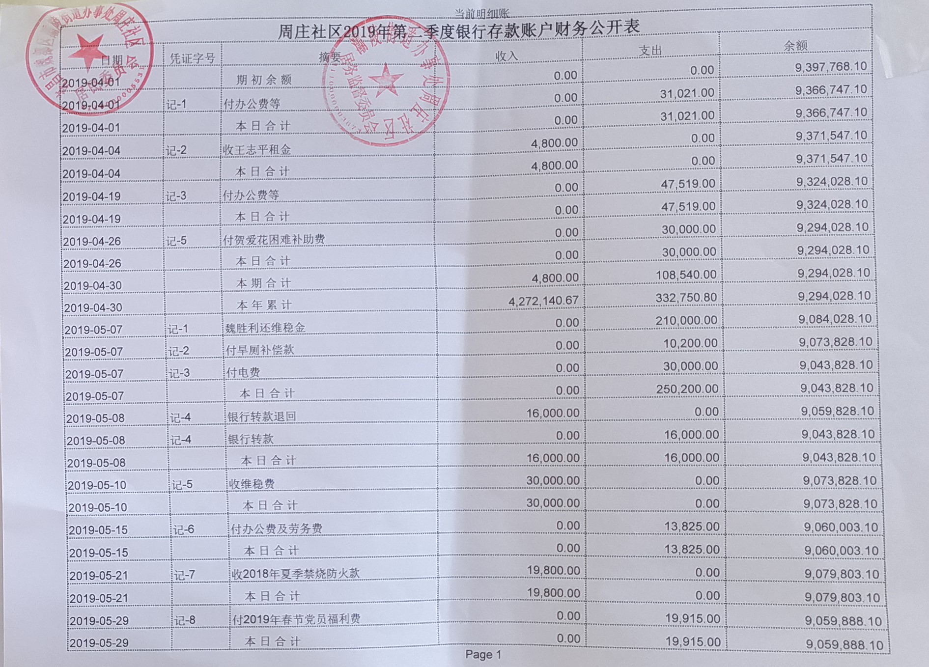 灞陵办事处周庄社区2019年第二季度银行存款账户财务公开表