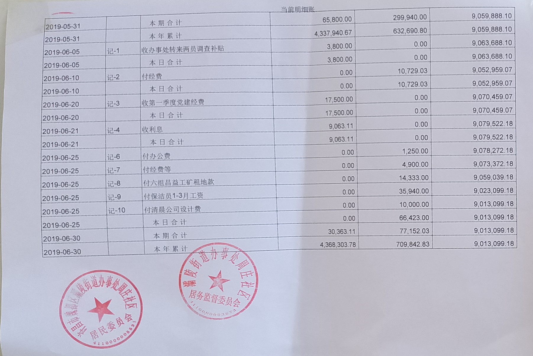 西关办事处西关社区2019年第二季度现金、银行存款账户公开表