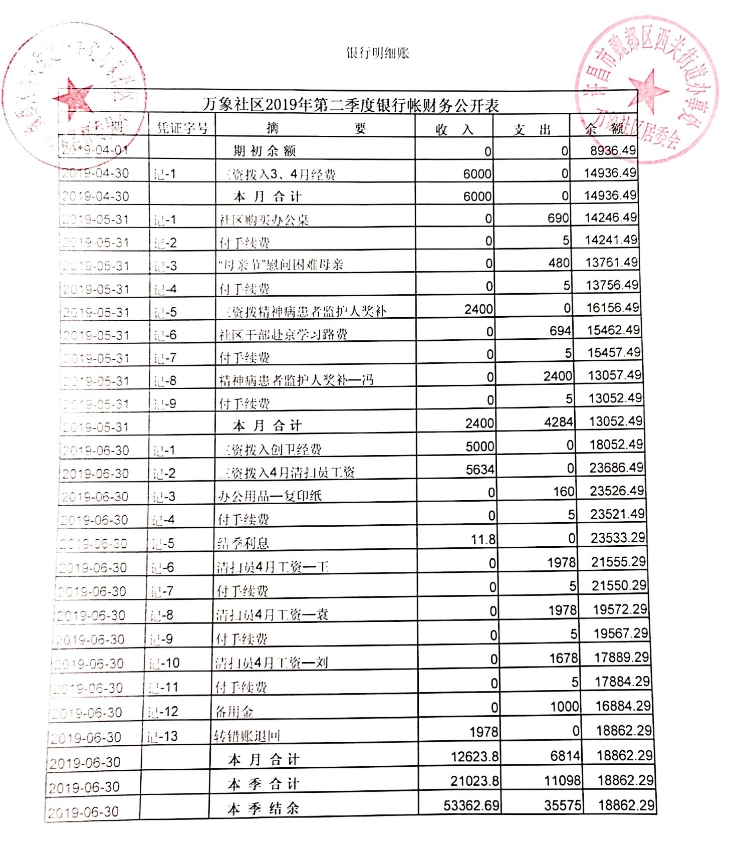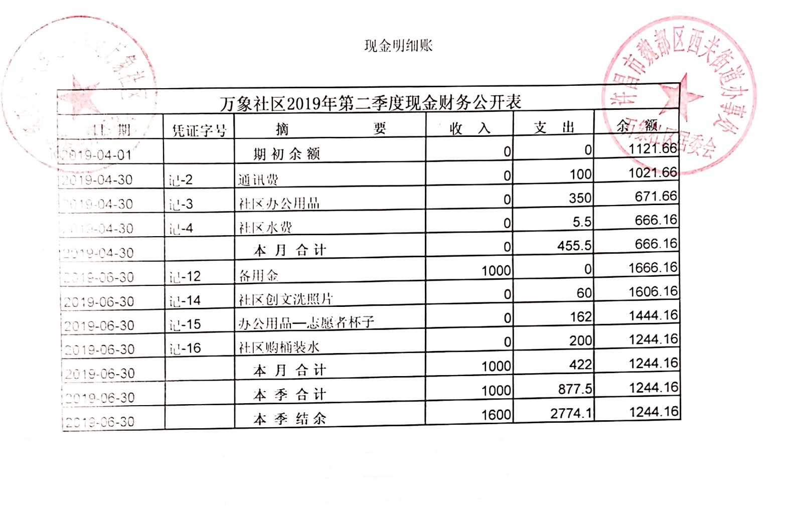 西关办事处万象社区2019年第二季度现金、银行存款账户公开表