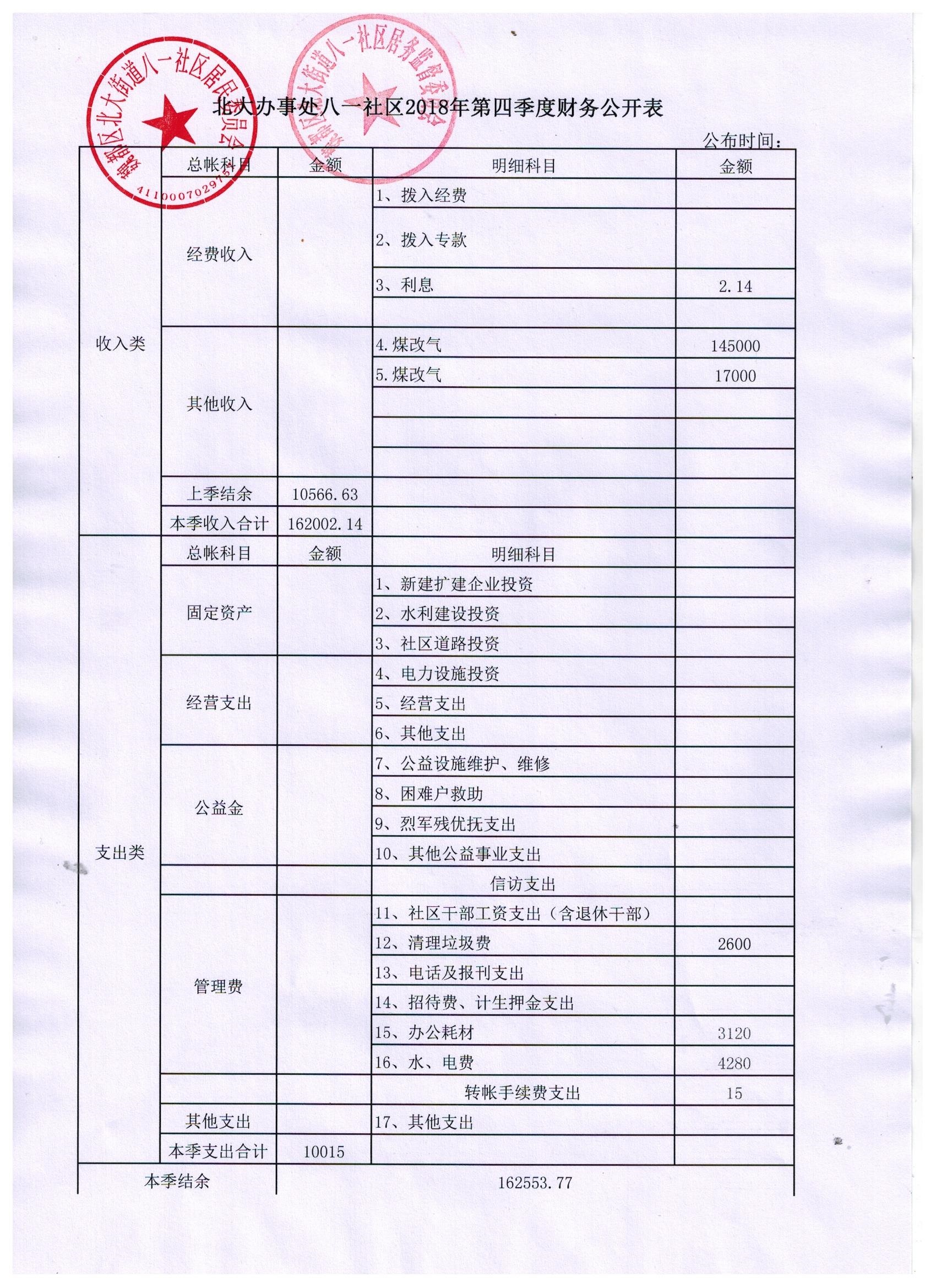 北大办事处八一社区2018年第四季度财务公开表