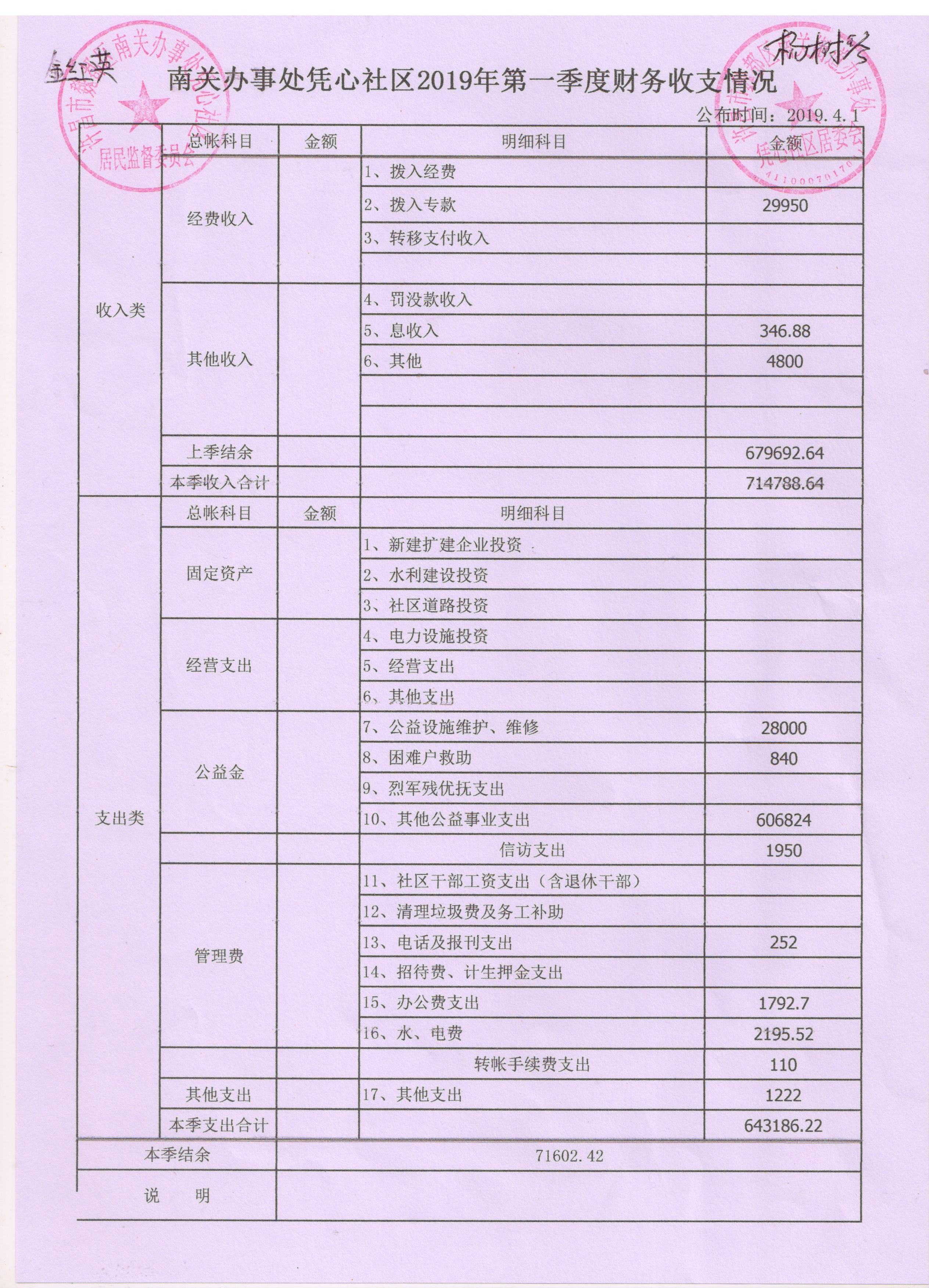 南关办事处凭心社区2019年第一季度现金、银行存款账户公开表