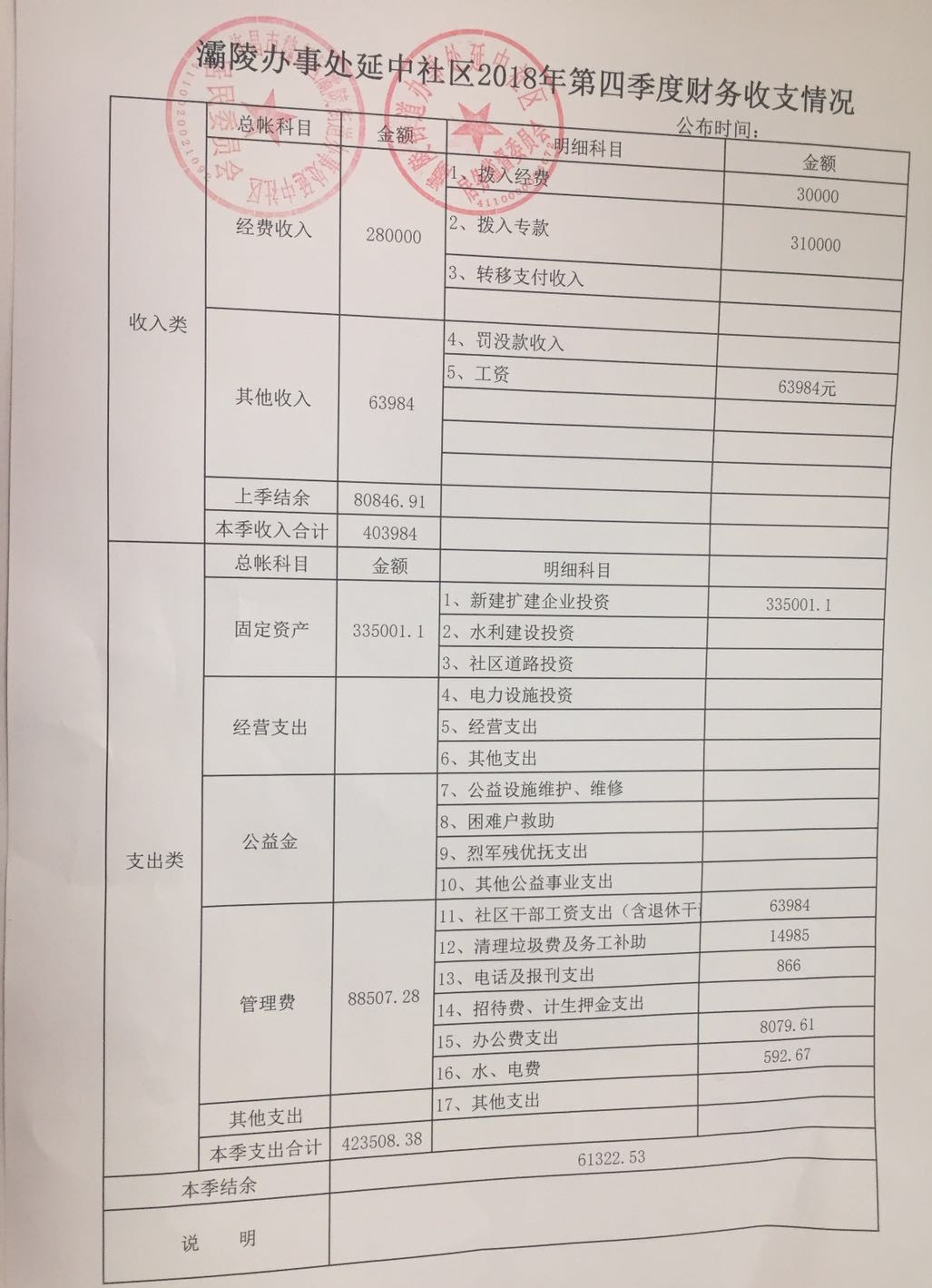 灞陵办事处延中社区2018年第四季度财务公开表