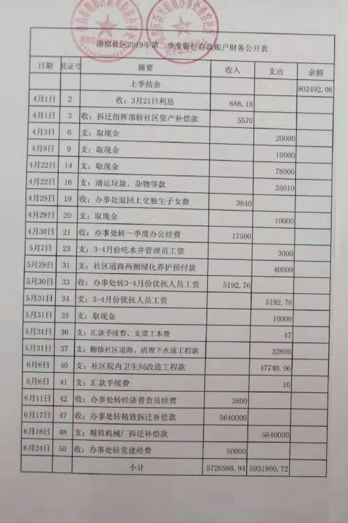 新兴办事处潘窑社区2019年第二季度现金、银行存款账户公开表