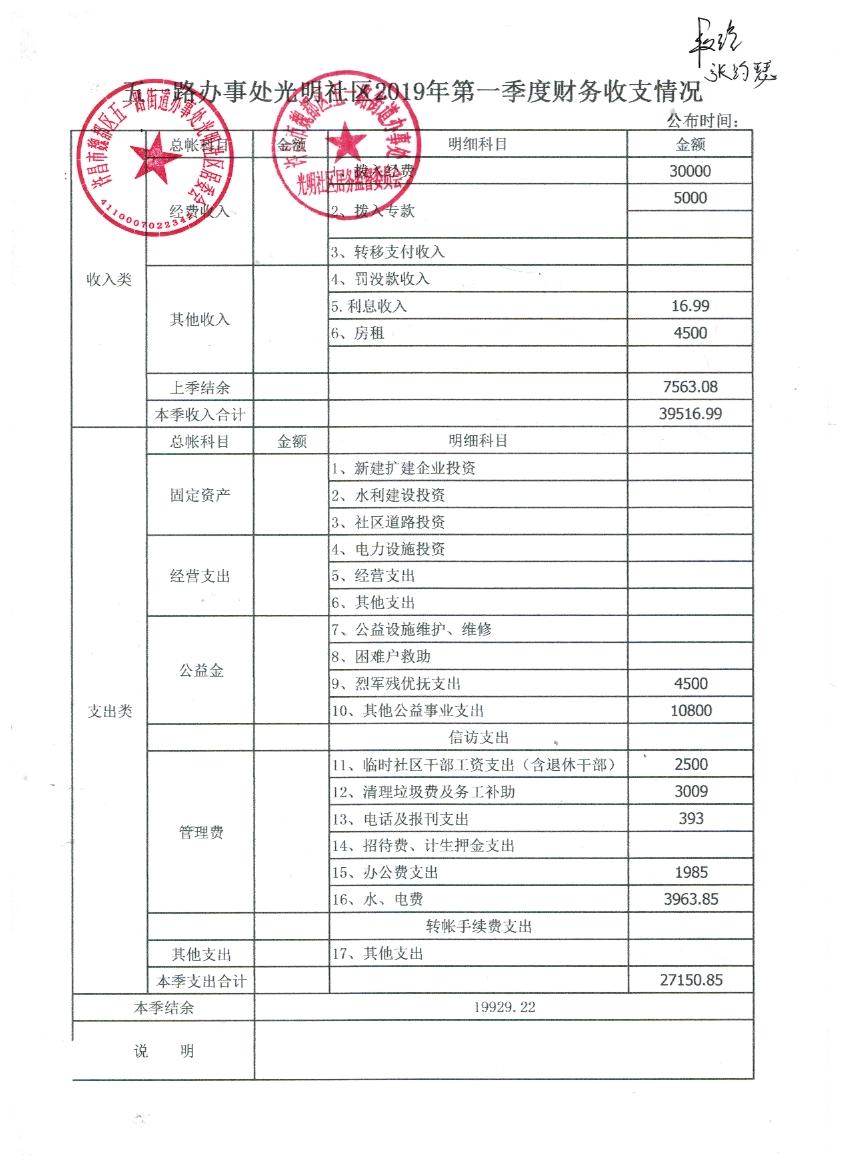 五一路办事处光明社区2019年第一季度财务公开表